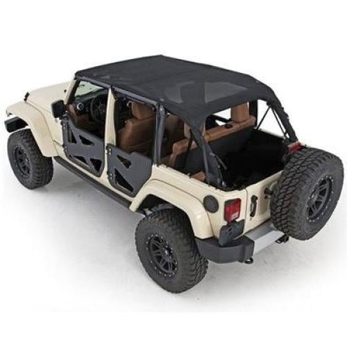 Fitment:Direct Fit Colour:Black Coverage:Front and Rear TECHNICAL DETAILS 07-18 Wrangler JK, 4-Door Black mesh Manufactured out of durable UV treated material Heavy-duty nylon webbing with reinforced stitching Extreme duty buckles manufactured out of reinforced nylon-designed to last forever Reduces the heat and glare of the sun Allows cool air to flow through unique mesh design Windshield header channel sold separately The unique design of Smittybilts Extended Mesh Tops are a quick and simple solution for Jeep owners that want to stay out of the sun, but still want cool air to circulate throughout the Jeeps Cab. That's right! You get the best of both worlds. Manufactured out of durable UV treated material with oversized heavy duty nylon webbing and buckles that will provide you with a lifetime of service. part number : S/B94600
