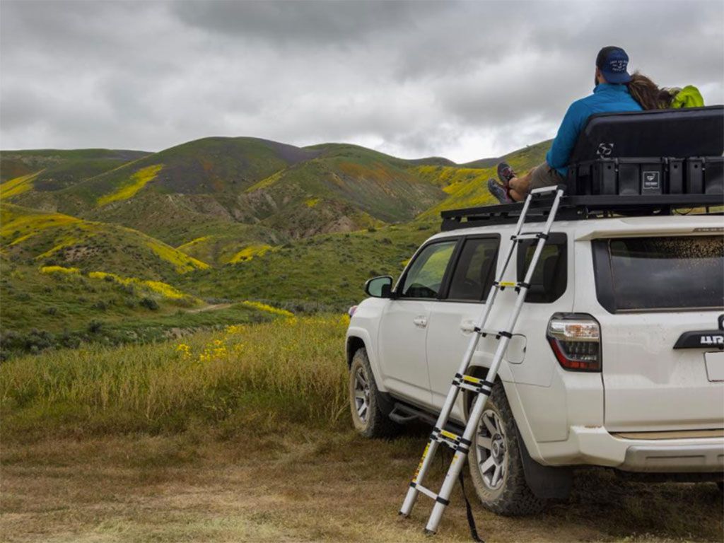 زوج من الأقواس التي يتم تأمينها على رف Slimline II وتسمح لسلم تلسكوبي من الألومنيوم / 2.6 متر بالاستقرار بشكل آمن على الرف.